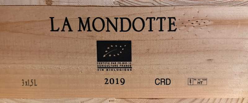 Une caisse bois fermée de Bordeaux Château la Mondotte 3 magnums 2019