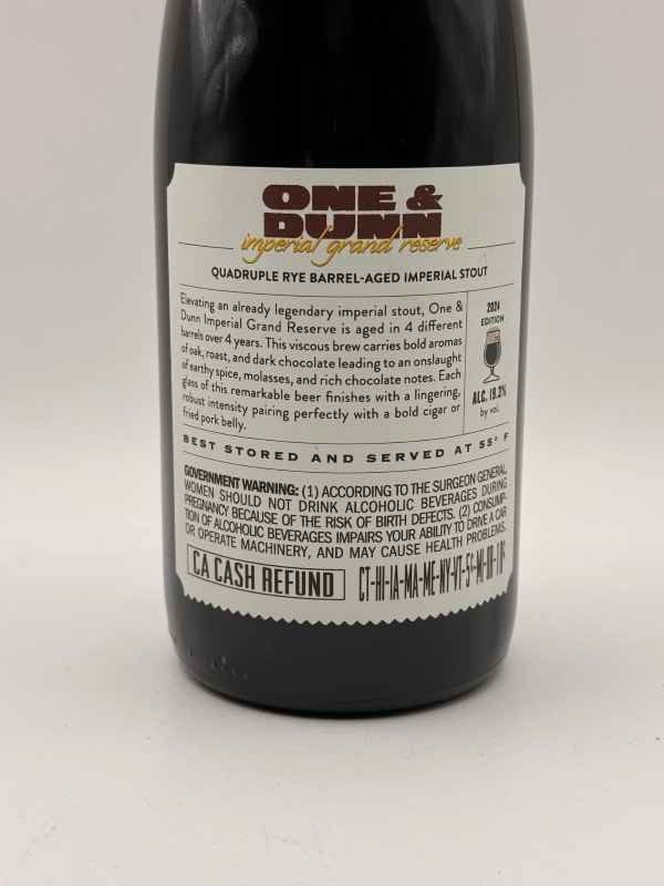 Stout Impérial vieilli en fût de seigle quadruple Rehaussant une stout impériale déjà légendaire. Bruery One and Dunn Imperial Grande Reserve est vieillie pendant 4 ans dans 4 fûts différents. Cette bière visqueuse dévoile des arômes intenses de chêne, de torréfaction et de chocolat noir, qui se prolongent par une explosion d’épices terreuses, de mélasse et de riches saveurs chocolatées. Chaque verre de cette bière remarquable se termine par une finale longue et intense, parfaite avec un cigare corsé ou une poitrine de porc frite.