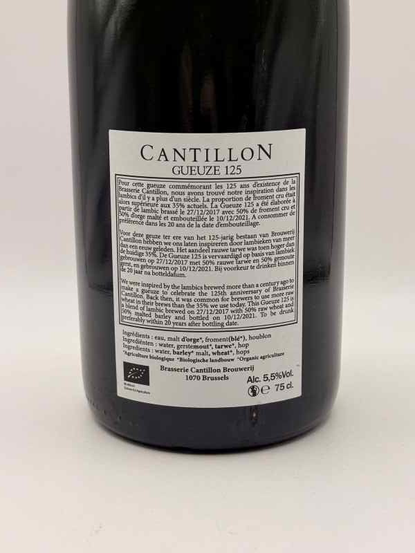 Nous avons été inspirés par les lambics brassés il y a plus d’un siècle pour créer une gueuze. Ceci afin de célébrer le 125e anniversaire de la Brasserie Cantillon. À l’époque, il était courant que les brasseurs utilisent plus de blé brut dans leurs brassins que les 35 % que nous utilisons aujourd’hui. Car cette Gueuze 125 est un assemblage de lambic brassé le 27/12/2017 avec 50 % de blé brut et 50 % d’orge maltée. Puis elle a été mise en bouteille le 10/12/2021. C’est à consommer de préférence dans les 20 ans suivant la date de mise en bouteille.