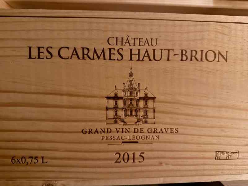 Une caisse bois de 6 bouteilles du Château Carmes Haut Brion 2015 Bordeaux. Fermée et conservée en cave climatisée chez Wines And Spirits SA
