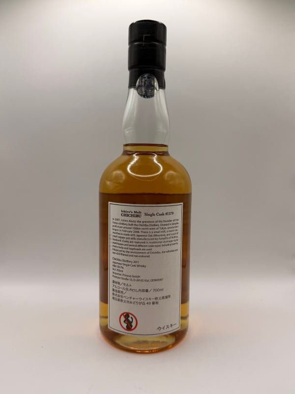 Il s’agit d’un whisky vraiment exceptionnel avec cette édition limitée. Chichibu Ichiro’s Cask 1179 single malt spécialement choisie pour Prineus GmbH en Allemagne. Avec seulement 216 bouteilles jamais produites, cette édition incarne l’apogée de l’exclusivité et de la rareté. Donc ce whisky de Chichibu, distillé en 2011. Car il a été soigneusement vieilli dans un fût unique Bourbon, spécifiquement identifié comme le fût n°1179. Donc chaque année qui passe enrichit le caractère avec des nuances et des complexités. Ceci aboutissant à un profil de saveur vraiment exceptionnel qui est à la fois envoûtant et singulier.