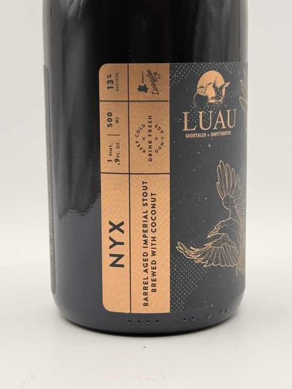 Cette Imperial Stout Mortalis Barrel Aged Nyx | Coconut red metallic wax a vieilli 13 mois en fûts Wild Turkey. Après vieillissement, elle a été conditionnée avec une quantité impressionnante de noix de coco grillée pour créer une saveur riche et délicieusement onctueuse qui vous fera prendre le contrôle de votre âme. D’un noir profond, cette bière, telle la Déesse de la Nuit, vous emporte sans retour !